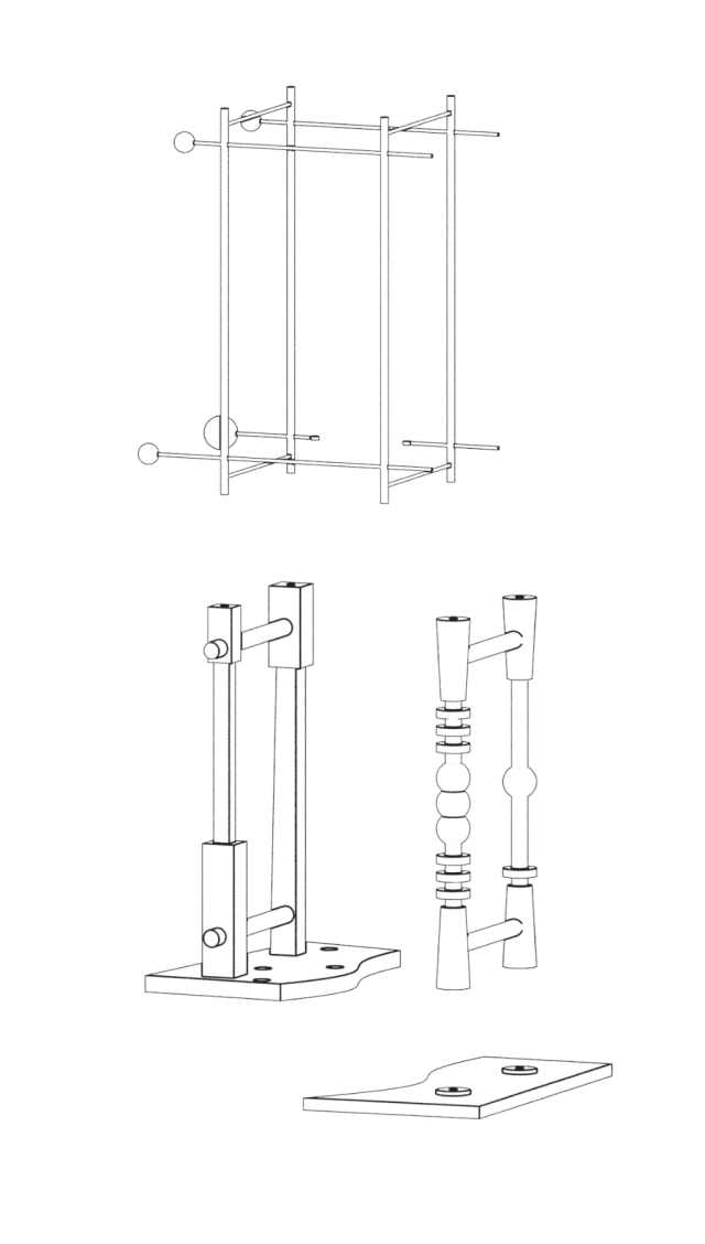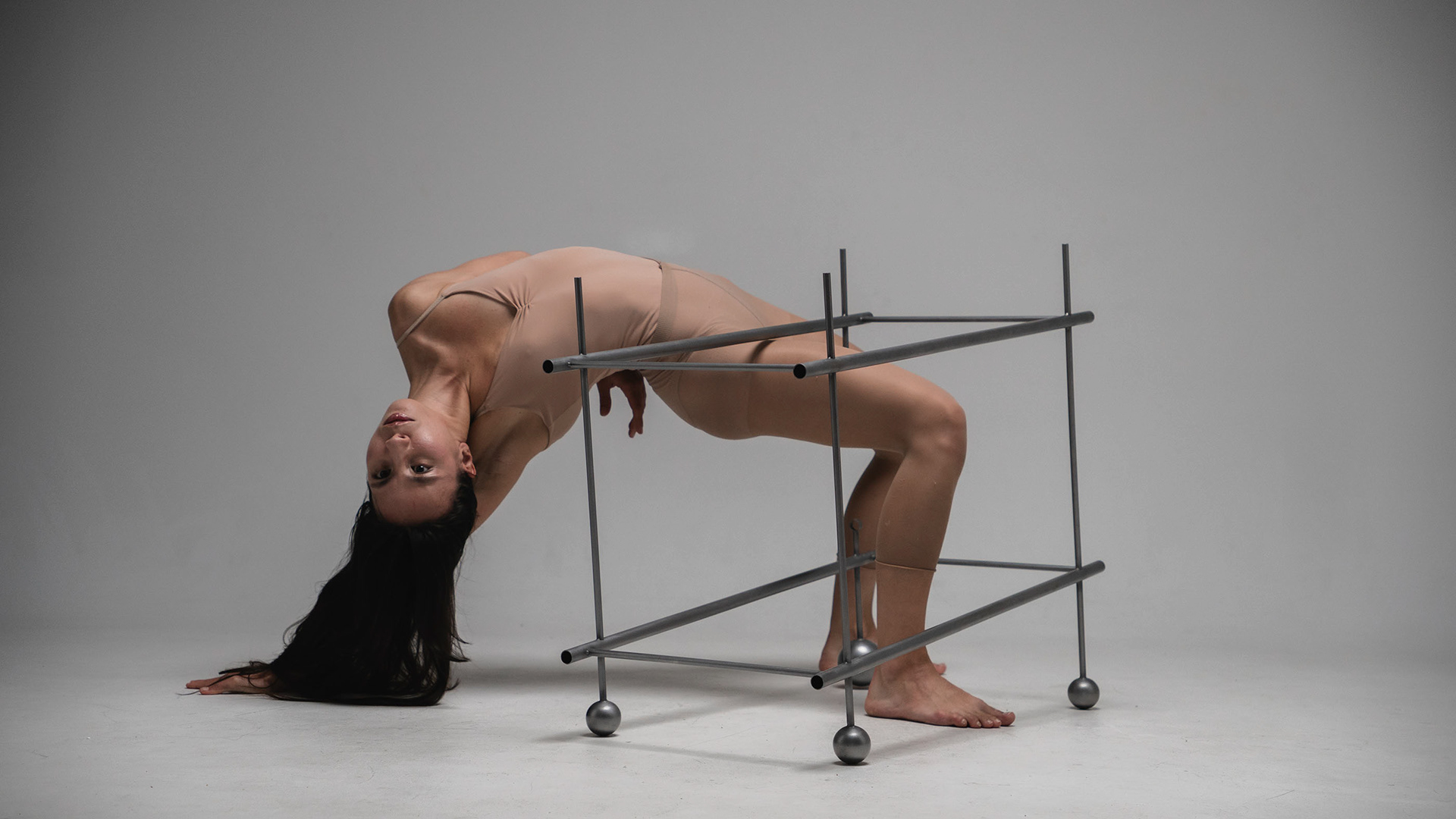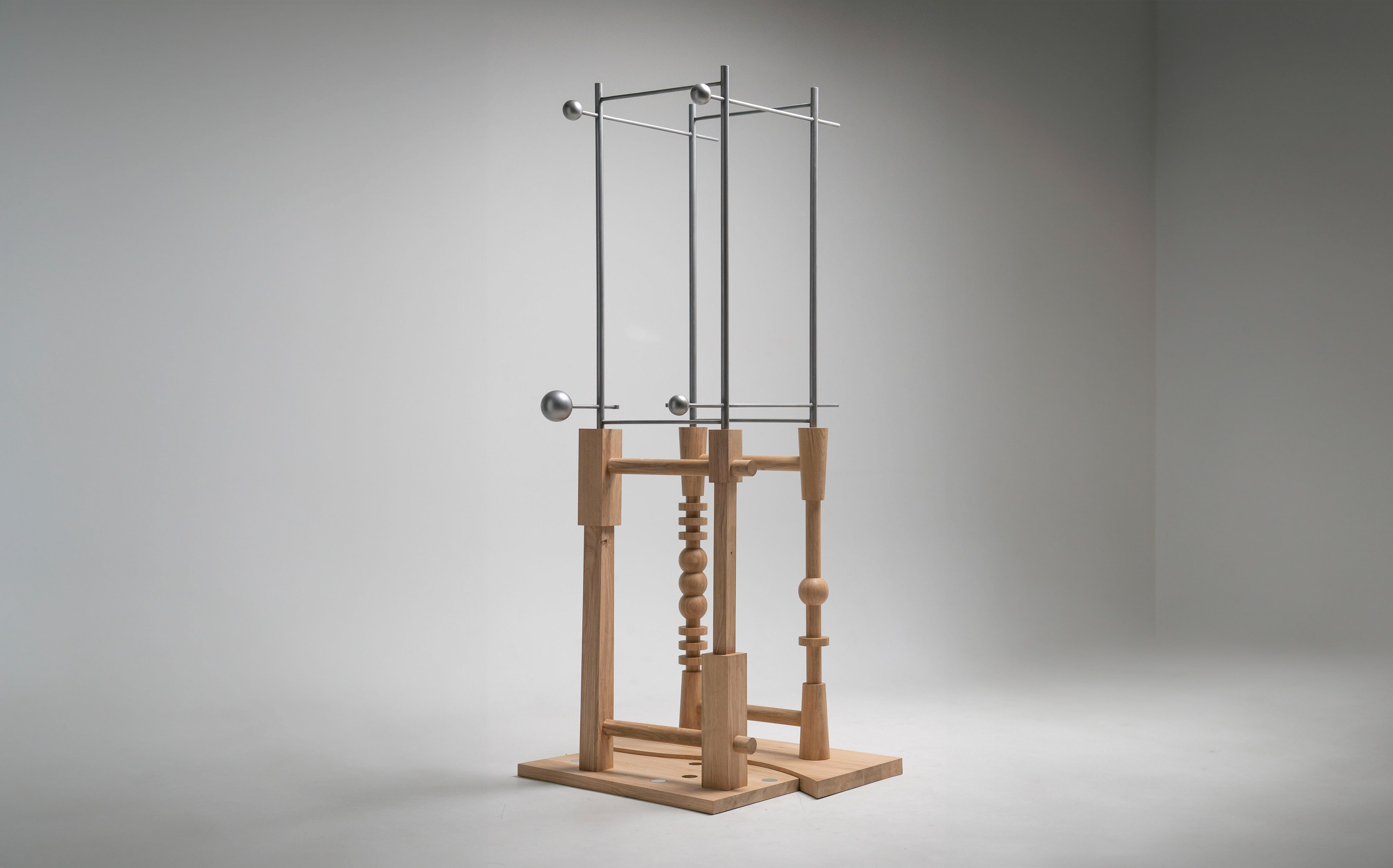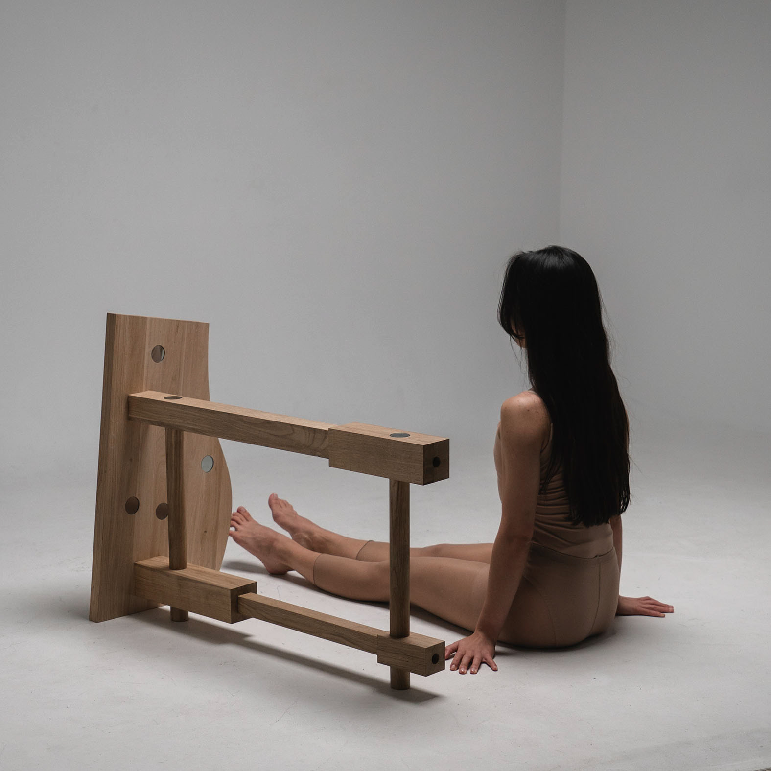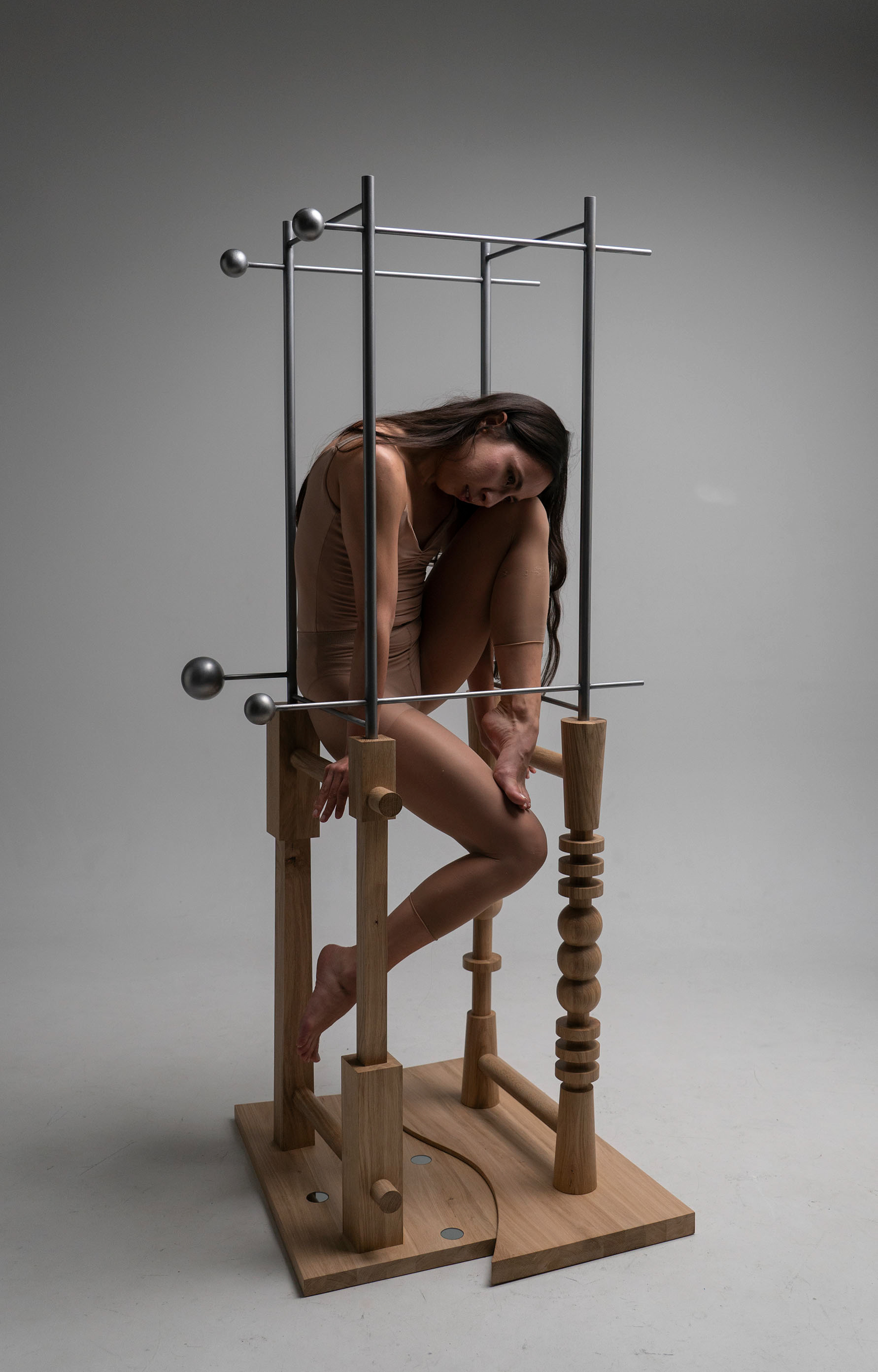 A structure consisting of four parts, oak wood, steel, glass, 2025 178 x 75,5 x 82 cm Manufacturing a steel structure: Stanisław MacLeod Manufacturing a wooden structure: Jerzy Wasilewski Model: Mariia Lozova Photography: Aleksandr Patkanian